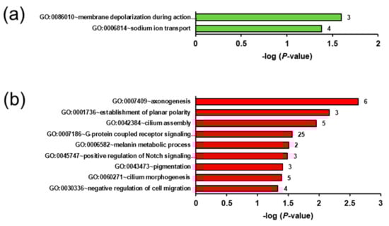 Regarding the ecdysterone effect in the lean groups, GSEA of the transcripts upregulated in group LE vs. LC revealed only two enriched (p < 0.05) biological process terms, namely, membrane depolarisation during action potential and sodium ion transport (Figure 5a), and only one enriched (p < 0.05) KEGG pathway, i.e., carbohydrate digestion and absorption. The enriched biological process terms assigned to the transcripts downregulated in group LE vs. LC were axonogenesis, the establishment of planar polarity, cilium assembly, G-protein coupled receptor signalling pathway, melanin metabolic process, positive regulation of Notch signalling pathway, pigmentation, cilium morphogenesis, and negative regulation of cell migration (Figure 5b). No significantly enriched KEGG pathways were assigned to these downregulated transcripts.