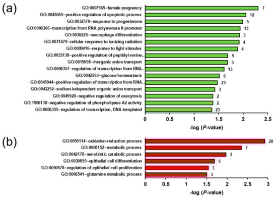 Enriched gene ontology (GO) biological process terms assigned to the genes upregulated (a) and downregulated (b) in the liver of group LE (lean rats fed with ecdysterone) vs. LC (lean rats fed without ecdysterone). GO terms are sorted by their enrichment p-values (EASE score) (top: lowest p-value, bottom: highest p-value). All GO terms with p-values < 0.05 are shown. The number of genes is shown next to the bars.