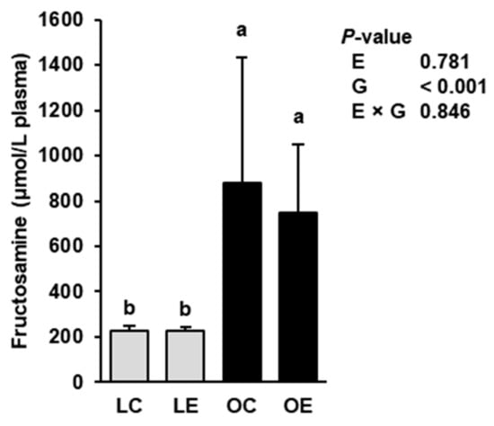 Plasma fructosamine concentration of lean and obese Zucker rats fed a semisynthetic diet without or with 0.5 g ecdysterone per kg diet for four weeks. Data are means ± SD; n = 8 rats per group. Means not sharing the same letters (a,b) differ (p < 0.05). Abbreviations: E, ecdysterone; G, genotype; LC, lean rats fed without ecdysterone; LE, lean rats fed with ecdysterone; OC, obese rats fed without ecdysterone; OE, obese rats fed with ecdysterone.