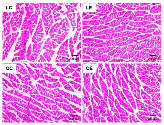 Haematoxylin- and eosin-stained M. gastrocnemius sections of lean and obese Zucker rats fed a semisynthetic diet without or with 0.5 g ecdysterone per kg diet for four weeks. Images are shown for one animal per group (magnification × 4). The scale bar indicates 200 µm. Abbreviations: LC, lean rats fed without ecdysterone; LE, lean rats fed with ecdysterone; OC, obese rats fed without ecdysterone; OE, obese rats fed with ecdysterone.