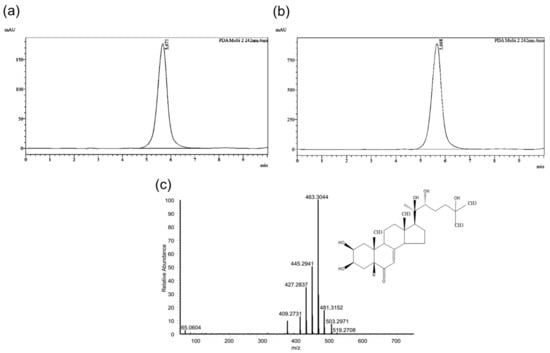 Chromatograms from the HPLC analysis of ecdysterone at a concentration of 150 µg/mL (a) and 750 µg/mL (b) in MeOH. (c) Representative high-resolution total ion current (TIC) chromatogram of ecdysterone.