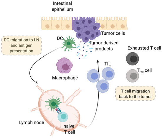 Human studies have not allowed, so far, to mechanistically define the sequence of events that cause accumulation of specific immune subsets in cancer tissues. Despite the fact that recent high-dimensional studies have shed light on the variety of immune cells in human CRC tissues [61], fully elucidating the complex dynamics and relative contribution of resident versus recruited immune components requires further studies. Nonetheless, a general scenario depicting how immune cells infiltrate a tumor is represented by the cancer immune cycle [62], according to which antigen-presenting cells, mostly dendritic cells (DCs), infiltrate the tumor tissue, uptake tumor-derived products by various innate recognition receptors, produce type I interferons and traffic to draining lymph nodes, where they present antigens to antigen-specific cytotoxic T cells (Figure 1). This event may be more efficient in tumors expressing neoantigens or with a high mutational burden [63]. Subsequent migration of activated T cells through the circulation and back to the tumor, guided by chemokine gradients including primarily CXCL9/CXCL10, would account for the high density of T cells in cancer tissues [64]. As to the activation status of T cells, prolonged immunosuppressive circuits, such as inhibitory axes like CTLA-4 and PD-1, may be responsible for T-cell dysfunction, accounting for the immune escape and cancer progression.