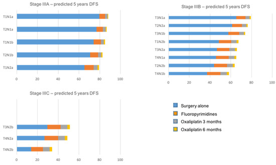 Prognostic subgroups within stage III colon cancers by therapeutic options: surgery alone; fluoropyrimidine alone; oxaliplatin-based doublet for 3 months; oxaliplatin-based doublet for 6 months.