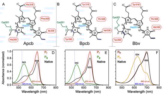 - Xu, X.-L.; Gutt, A.; Mechelke, J.; Raffelberg, S.; Tang, K.; Miao, D.; Valle, L.; Borsarelli, C.D.; Zhao, K.-H.; Gärtner, W. Combined mutagenesis and kinetics characterization of the bilin-binding GAF domain of the protein Slr1393 from the cyanobacterium Synechocystis PCC6803. ChemBioChem 2014, 15, 1190–1199. [Google Scholar] [CrossRef]