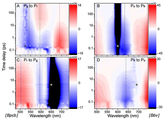 Time-resolved electronic spectra during reversible photoswitching of Bpcb and Bbv in buffer solution. The fs-TA 2D-contour plots of (A) Bpcb Pg → Pr, (C) Bpcb Pr → Pg, (B) Bbv Po → Pfr, and (D) Bbv Pfr → Po transitions were collected using a 525 nm actinic pump with 650 nm LEDs, 650 nm actinic pump with 505 nm LEDs, 600 nm actinic pump with 650 nm longpass-filtered tungsten lamp, and 690 nm actinic pump with 600 nm LEDs, respectively, up to 900 ps after electronic excitation. Strong scattering from the pump beam (specific location marked by the asterisk in each panel) was largely removed by subtracting the −2 ps TA trace from the subsequent traces, although residual scattering can be clearly seen in black (panels B and C). A weak positive band (light red color) is marked by the dashed rectangle at late times in panel (C). Key probe regions for dynamic analysis of the TA marker bands are highlighted by the color-coded vertical lines in each panel (see the associated least-squares fits with retrieved time constants in Supplementary Figure S2).