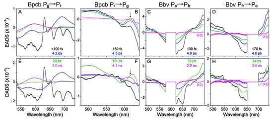 Global analysis of the fs-TA spectra during CBCR photoswitching processes. The underlying EADS/DADS of Bpcb Pg → Pr, Bpcb Pr → Pg, Bbv Po → Pfr, and Bbv Pfr → Po transitions are shown in panels (A,E), (B,F), (C,G), and (D,H), respectively. The retrieved spectra are ordered from fastest to slowest lifetimes in black, blue, green to magenta traces, with the associated lifetimes color-coded and listed in insets. To remove pump scattering effect on data analysis, the probe window was truncated when the scattering signal was on the edge of detection window (panels (A,B,E,F)) or scattering region was set to zero (panels (C,D,G,H)). Black arrows in panels (B,F) show a weak ESA band at ~615 nm.