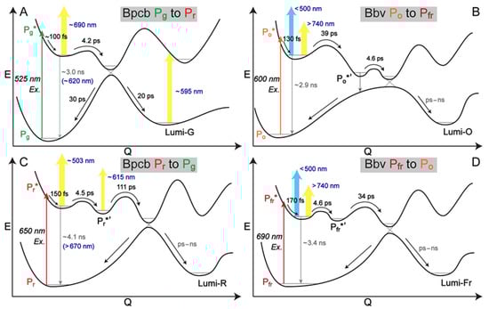 Representative potential energy surfaces of Bpcb (A) Pg → Pr, (C) Pr → Pg, and Bbv (B) Po → Pfr, (D) Pfr → Po photoconversion. The photoexcitation (Ex.), ESA, SE, GSB, and HGSA transitions are illustrated by the color-coded vertical arrows. The arrow lengths are not drawn to scale with the exact energy gaps. Reaction scheme is denoted by curved arrows with characteristic time constants retrieved from global analysis of the corresponding TA spectra in Figure 2 and Figure 3. A minor fluorescence component is shown by a dim downward arrow. The ps-ns time scales for Lumi state formation in panels (B–D) indicate a long-lived state beyond our current detection time window. The horizontal axis “Q” represents the dominant cofactor ring-twisting motions that could change as time progresses after photoexcitation, while the protein environment continuously contributes to the cofactor nuclear motions.