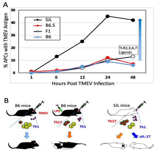Further studies using B6.S mice, which carry the H-2s with the resistant C57BL/6 background genes, are free from TMEV-IDD and display lower viral loads in the spinal cord compared to susceptible SJL mice [38]. Interestingly, viral infectivity and/or replication in glia and antigen-presenting cells (APCs) from TMEV-IDD resistant B6.S, B6, and F1(B6XSJL) mice are significantly lower compared to these SJL cells [37,59]. In vitro studies using APCs from B6.S and SJL mice show that TLR2, 3, 4, and 7-mediated signaling augment viral infection leading to the preferential differentiation of the pathogenic Th17 cell type in susceptible SJL mice [38,66]. Microglia and macrophages from susceptible SJL mice produce higher levels of IL-6 and IL-1 after TMEV infection compared to those cells from either B6, B6.S, or B10.S [67,68,69]. These observations indicate that the level of viral infectivity/replication controlled by non-MHC genes plays a critical role in the pathogenesis of chronic viral diseases. Taken together, these results strongly suggest that the viral replication levels in APCs critically affect the induction of protective vs. pathogenic Th cell types via the signaling of pattern recognition receptors for innate immune responses (Figure 1).