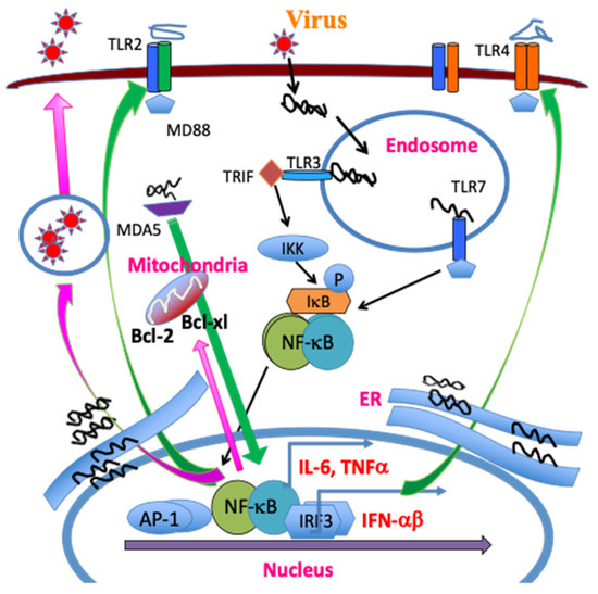 TMEV infection leads to release of a single stranded RNA genome and double stranded RNA replication intermediates in the endosome. The single RNA genome is recognized by TLR7, and the dsRNA intermediate, by TLR3. The TLR signaling activates NF-κB, AP-1 and IRFs, which in turn result in the production of various cytokines. MDA5 also recognizes viral messages leading to NF-κB activation. These activations lead to the additional expression and activation of TLR2/4, further activating NF-κB. The amplified NF-κB signaling promotes TMEV replication and the expression of Bcl-2 and Bcl-xL, which prevent virus-induced cellular apoptosis, increasing viral replication and cytokine production.