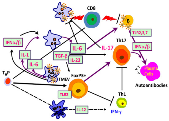 Utilization of TMEV VP272–86-specific TCR-Tg mice in analyzing the development of CD4+ T cell subpopulations during TMEV infection [65,136]. These signals induce the production of IL-1, IL-6, IFNα/β, and TGF-β, which promote elevated induction of pathogenic FoxP3+ T-reg, Th17, and Tc17. Furthermore, IL-6 and IL-17, in addition to Tim and PDL-1, synergistically inhibit protective CD8+ T lymphocytes (CTL) function [107]. IFNα/β inhibits Th1 responses and elevates the expression of costimulatory molecules on antigen-presenting cells (APCs), which in turn promotes the induction of Th17 responses [63,113].