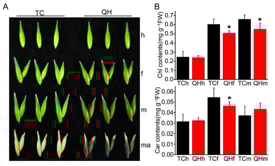 Phenotype identification and photosynthetic pigment content measurement during oat bract development. (A) Identification of the phenotype of bracts; TC indicates ‘Triple Crown’; QH indicates ‘Qinghai 444’; h, f, m and ma represent the heading, flowering, milk, and mature stages, respectively. (B) The content of photosynthetic pigments in bracts was determined. Bracts at different stages were selected, and the total chlorophyll content and carotenoid content were measured. The asterisk represents a significant difference in total chlorophyll and carotenoid content of ‘Triple Crown’ and ‘Qinghai 444’ bracts (* p ˂ 0.05, Student’s t-test), with 6 replicates.