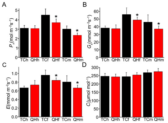 Gas exchange parameters of bracts during oat bract development. (A) Pn, the net photosynthetic rate; (B) Gs, stomatal conductance; (C) E, the transpiration rate; (D) Ci, the intercellular carbon dioxide concentration. The asterisk represents significant difference in ‘Triple Crown’ and ‘Qinghai 444′ bracts (* p ˂ 0.05, Student’s t-test), with 9 replicates.