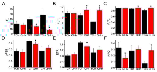 Chlorophyll fluorescence parameters of bracts during oat bract development. (A) F0, the minimum fluorescence; (B) Fv/F0, PSII potential photosynthetic activity; (C) Fv/Fm, PSII maximum photochemical efficiency; (D) φPSII, actual PSII photochemical efficiency; (E) ETR, PSII electron transfer rate; (F) NPQ, non-photochemical quenching. The asterisk represents the difference in ‘Triple Crown’ and ‘Qinghai 444’ bracts (* p ˂ 0.05, Student’s t-test), with 3 replicates.