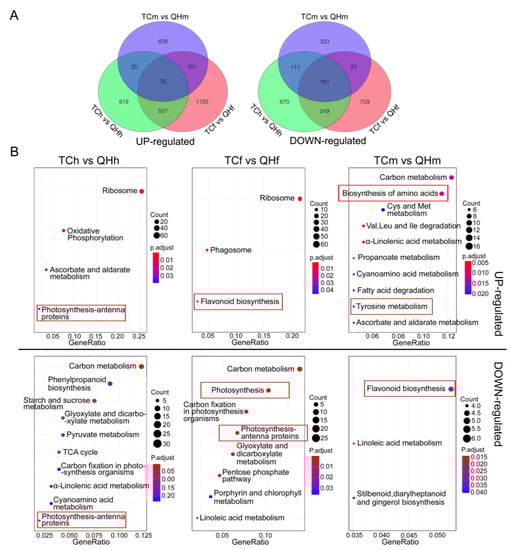 The enrichments of DEGs during oat bract development. (A) Venn diagrams of upregulated and downregulated DEGs in ‘Qinghai 444’, compared to those in ‘Triple Crown’. (B) KEGG enrichment of upregulated and downregulated DEGs in ‘Qinghai 444’, compared to those in ‘Triple Crown’. Red square line represents the pathways which are related to photosynthesis and anthocyanin or melanin biosynthesis in this study.