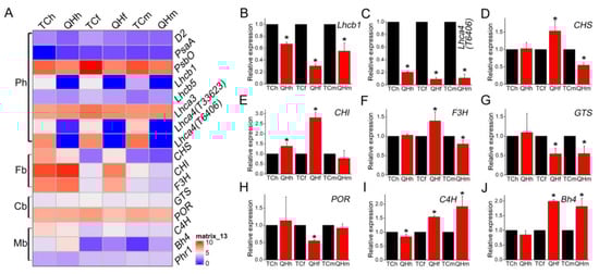 Heatmap and qRT-PCR verification of key genes during oat bract development. (A) Heat map analysis of the expression of key genes at the three stages. “Ph”, photosynthesis; “Fb”, flavonoid biosynthesis; “Cb”, chlorophyll biosynthesis; “Mb”, melanin biosynthesis. (B–J) qRT-PCR analysis of key genes at the three stages. Relative expression values of ‘Qinghai 444’ samples were calculated and normalized with ‘Triple Crown’ as the control in one single stage. The asterisk represents significant differences in relative expression of genes (* p˂0.05, Student’s t-test), with 3 replicates for each experiment.