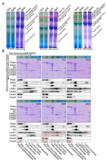 Accumulation of thylakoid membrane protein complexes and their subunits during oat bract development. (A) BN-PAGE analysis of thylakoid membrane protein complexes. The thylakoid membrane was solubilized with 1% DM, and the total protein was loaded (100 µg). The thylakoid membrane protein complex was separated in 5–12% BN-gel, and then, CBB stained (right). (B) BN/SDS-PAGE two-direction electrophoresis analysis of thylakoid membrane protein complexes. After the thylakoid membrane protein complex was separated in the first direction by BN-PAGE, it was further separated in the second direction by 15% SDS-urea-PAGE, and then, stained with CBB and Western blotting. Red square line represents significantly different complexes or subunit proteins.