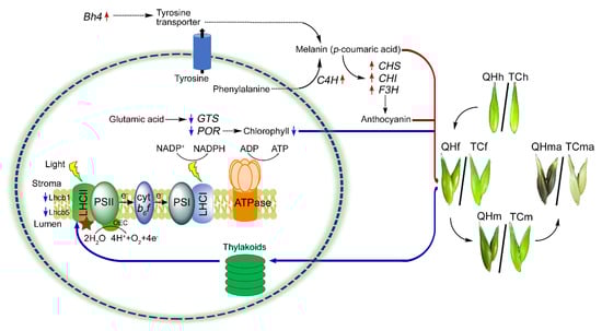 Bract color is among the important morphological characteristics in Gramineae plants [8,9]. During the reproductive growth of cereal plants, bracts usually turn yellow from green at heading, flowering and seed maturation. They could also turn black, such as in rice (Oryza sativa L.) and oat (Avena sativa L.). The formation of black bracts is related to the accumulation of melanin. Melanin is a strong antioxidant, which can endow seeds with more vitality [10]. Melanin can enhance the mechanical strength of the bract, protecting the developing seeds [11]. It can also protect plants from excessive light damage and improve resistance to Fusarium spp. [12,13,14]. Varga et al. [15] found that the component of melanin in oat bracts was homopolymer of p-coumaric acid, one of the key intermediates in the anthocyanin biosynthesis pathway with phenylalanine as a precursor, which was catalyzed by cinnamate 4-hydroxylase (C4H) [16,17]. In wild rice, black is considered to be the original color in the bracts controlled by two complementary genes—Bh4 (black hull 4) and Phr1 (phenol reaction 1)—encoding a tyrosine transporter and a polyphenol oxidase, respectively, which are involved in melanin biosynthesis [18,19,20,21]. Notably, recent studies have shown that the formation of melanin in barley (Hordeum vulgare L.) bracts occurred in chloroplasts [22]. The development of bracts is accompanied by the formation of the black phenotype, but the variation of photosynthesis in this process has yet to be clarified and needs further research.