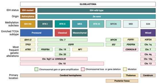 IDH-wt GBM is defined by its heterogeneous molecular landscape [,,,,,,,,,]. Two landmark studies have subclassified IDH-wt GBM based on genetic, epigenetic, and transcriptomic features. Utilizing samples from The Cancer Genome Atlas (TCGA) network, Verhaak et al. described four different subtypes of IDH-wt GBM: classical (CL), mesenchymal (MES), proneural (PN), and neural (NE) []. The NE subtype has since been discarded, as later findings determined this group to be non-tumor specific []. Using another approach, Sturm et al. classified IDH-wt GBM into five epigenetic groups on the basis of DNA methylation patterns []. These groups have been further modified and expanded by Capper et al. [] into seven methylation subclasses, each defined by a distinct set of molecular alterations [,,] (Figure 1). Three of the most common methylation subclasses among adult patients—RTK I, RTK II, MES—are enriched for the PN, CL, and MES Verhaak expression profiles, respectively []. These tumor entities typically exhibit chromosome 7 gain (with or without epidermal growth factor receptor or EGFR amplification), as well as loss of chromosomes 9q21 and 10 [,,]. Despite sharing common chromosomal alterations, these groups can be further differentiated by subclass-specific changes: platelet-derived growth factor receptor α (PDGFRA) amplification in RTK I, gain of chromosomes 19 and 20 in RTK II, and neurofibromin 1 (NF1) mutations in MES tumors [,,].
