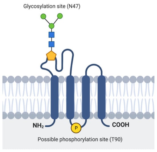 The major part of EMP3 consists of four hydrophobic membrane-spanning domains spanning 21 amino acids each [,] (Figure 2). There are two extracellular domains (ECD) of 41 and 18 amino acids each [,]. The three intracellular domains consist of short cytoplasmic N-and C-terminal tails and a loop of 13 amino acids [,]. Its hydrophobic regions, particularly the 2nd and 4th membrane-spanning domains, are highly conserved among the PMP22 protein family [,]. In addition, EMP3′s domains are assumed to be subject to several post-translational modifications (PTMs). For example, EMP3′s first ECD is predicted to include two N-glycosylated residues at asparagine 47 (N47) and 56 (N56) [,,]. Between these two residues, only N47 has been experimentally confirmed to be necessary and sufficient for glycosylation, indicating that the attachment of N-linked glycans solely occurs at this residue or that N56-glycosylation requires the presence of asparagine at position 47 []. The glycan modifications attached to EMP3 are diverse, because several bands migrating between 20 and 30 kDa, all amenable to enzymatic deglycosylation, have been detected by immunoblotting []. While the functional relevance of N-linked glycosylation on EMP3′s function remains to be determined, current knowledge on glycoproteins suggests that this PTM could be important for protein homeostasis, cell adhesion, or cell-to-cell communication [,]. In addition to being glycosylated, EMP3 is predicted to harbor a protein kinase phosphorylation site at threonine 90 within its intracellular loop []. However, the existence and functional relevance of this predicted PTM are yet to be confirmed.