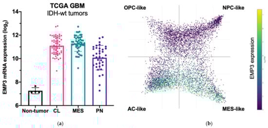 Among GBM Verhaak subtypes, EMP3 expression is highest in MES GBM followed by CL GBM, and is lowest in the PN subtype [,,]. Recent scRNA-seq of GBM tumors also confirm high expression of EMP3 in mesenchymal-like and astrocytic-like cells roughly matching to the MES and CL Verhaak subtypes, respectively [] (Figure 3).
