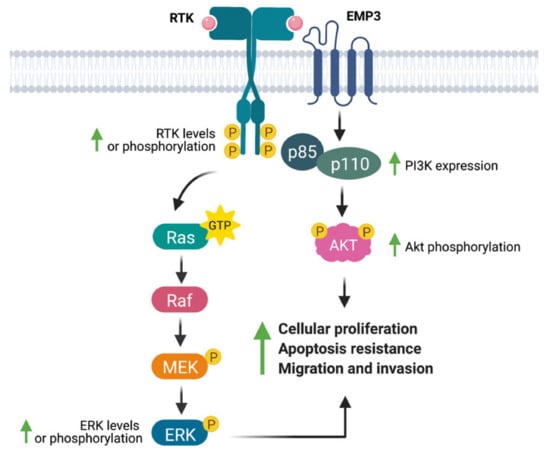 EMP3′s effects on receptor tyrosine kinase (RTK)-dependent mitogenic signaling. EMP3 has been shown to support the expression or phosphorylation of the RTKs EGFR and ErbB2/HER2, as well as their downstream effectors (ERK, PI3K, Akt). These biochemical findings correlate well with increased proliferation, apoptosis resistance, and migration of tumor cells.