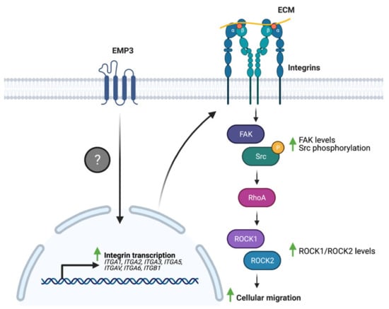 Several studies have linked EMP3 to the regulation of these ECM receptors. Wang et al. have demonstrated that EMP3 overexpression in human bladder cancer cells leads to an upregulation of the expression of a panel of integrins (α1, α2, α3, α5, αV, α6, and β1) at the mRNA level []. Furthermore, EMP3 overexpression increased the levels of total FAK and phosphorylated Src (p-Src) and induced the upregulation of the downstream FAK targets ROCK1 and ROCK2 []. These biochemical findings correlated well with increased migration of bladder cancer cells upon EMP3 overexpression []. Collectively, the findings indicate that EMP3 promotes a transcriptional program that leads to enhanced integrin expression, which subsequently promotes FAK/ROCK-dependent cellular migration (Figure 6). How EMP3 promotes the transcription of integrin-coding genes, and whether EMP3 also regulates integrin function at the protein level remains to be explored in future investigations.
