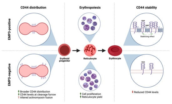 Similarly, Thornton et al. have demonstrated a functional association between EMP3 and CD44 in erythroid cells []. Loss of EMP3 appeared to alter the distribution of CD44 in the plasma membrane of dividing erythroid progenitors []. In particular, dividing EMP3-negative progenitors exhibited broader CD44 distribution and higher CD44 levels in the cleavage furrow compared to their EMP3-positive counterparts []. It is speculated that this results into altered actinomyosin fusion in EMP3-negative cells, leading to enhanced erythroid proliferation and increased reticulocyte yields []. Interestingly, CD44 also co-immunoprecipitated with EMP3 and was found to be reduced in EMP3-negative mature erythrocytes []. The reduction in CD44 levels was presumed to be due to increased plasma membrane vesiculation as EMP3-negative erythroid progenitors differentiate into erythrocytes []. Taken together, the findings indicate that EMP3 regulates erythropoiesis by stabilizing and organizing the distribution of CD44 within the plasma membrane (Figure 7).