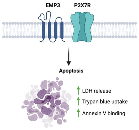 To date, the only functional link between EMP3 and P2RX7 is a biochemical description of their interaction. Using co-purification, co-immunoprecipitation, and GST pull-down assays performed on HEK293 cells, Wilson et al. have shown that EMP3 physically and stably interacts with the C-terminus of P2RX7 []. In this context, EMP3 is presumed to favor the cytolytic nature of P2RX7, because EMP3 overexpression induced membrane blebbing and increased lactate dehydrogenase (LDH) release, trypan blue uptake, and annexin V binding [] (Figure 8). This apoptotic-like phenotype was observed to be caspase-dependent, because it was inhibited by the caspase inhibitor z-VAD []. Whether this pro-apoptotic effect holds true in the setting of GBM remains to be explored. Given the two proteins’ individual links to GBM development, it is attractive to think that in GBM, EMP3 can shift P2RX7 to its pro-tumorigenic state instead. Further biochemical and functional studies, however, will be certainly required to test this hypothesis.