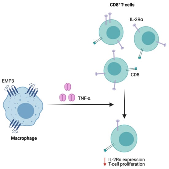 Supporting a possible immunoregulatory function of EMP3 in GBM, scRNA-seq of patient samples showed that EMP3 is highly expressed in GBM-infiltrating macrophages and to a lesser extent, T cells []. While immunological characterization of EMP3 remains very limited, one study has demonstrated the role of EMP3 in the inhibition of T cell-mediated immunity. Using mouse-derived macrophage cells, Kusumoto et al. have shown that Emp3 overexpression and knockdown reduced and promoted alloreactive induction of CD8+ CTLs, respectively []. The inhibition of CTL induction and proliferation by Emp3-overexpressing macrophages was further attributed to increased macrophage TNF-α production, which led to a concomitant downregulation of IL-2Rα on CD8+ cells [] (Figure 9). Moving forward, it will be interesting to explore whether EMP3-high macrophages in the GBM immune microenvironment are able to inhibit tumor-infiltrating CTLs via a similar mechanism. Likewise, it will be relevant to investigate how EMP3 in T cells impacts anti-tumor immunity.