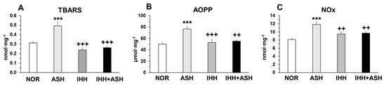 Oxidative stress markers in the brain. Units are expressed per milligram of protein. (A) TBARS, thiobarbituric acid-reactive substances; (B) AOPP, advanced oxidation protein products; and (C) NOx, nitric oxide species. Statistically significant differences between groups are presented with asterisks (*, vs. NOR) or crosses (+, vs. ASH). Two symbols indicate p < 0.01 and three symbols p < 0.001. F-values after running one-way ANOVAs with Bonferroni’s post hoc multiple comparison tests were: F = 10.83 (TBARS), F = 12.42 (AOPP) and F = 6.33 (NOx). Animal experimental groups are abbreviated as NOR, normoxic; ASH, acute severe hypoxia; IHH, intermittent hypobaric hypoxia; IHH+ASH, intermittent hypobaric hypoxia followed by acute severe hypoxia.