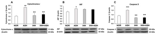 The measured mitochondrial apoptosis indicators, i.e., cytochrome c, apoptosis-inducing factor (AIF) and active caspase-3, showed significant increases in ASH, as indicated by Western blot semi-quantification (Figure 2). However, cytochrome c (Figure 2A) and active caspase-3 (Figure 2C) expression were similar to NOR levels in both IHH and IHH+ASH groups, having statistically significant lower levels when compared to ASH. The slight decrease in AIF was not statistically significant (Figure 2B).