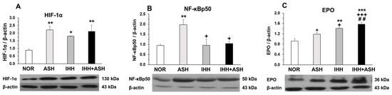 Similarly, the expression of HIF-1α significantly increased in the brain of all the groups exposed to hypoxia compared to the normoxic group (Figure 3A). The expression of the phosphorylated p50 subunit of NF-κB also increased significantly in ASH (Figure 3B), but, in contrast to what was found in HIF-1α, the expression of NF-κBp50 in intermittent hypoxia-exposed groups did not differ from NOR, both groups presenting significant differences when compared to ASH.