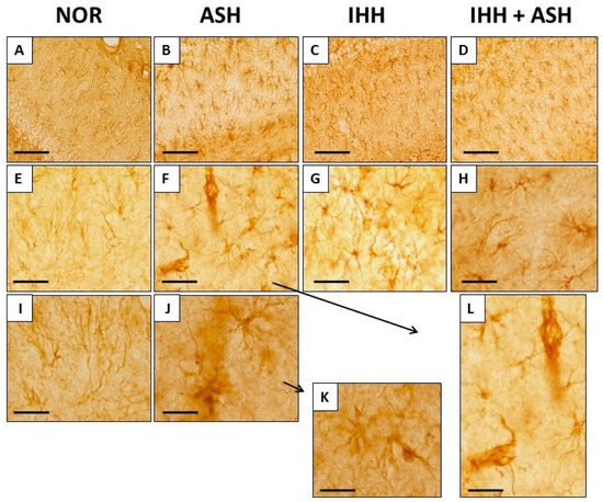 Glial fibrillary acidic protein (GFAP) immunohistochemistry in the Cornu ammonis (CA1) hippocampal zone at different magnifications. The increase in GFAP expression and changes in astrocyte morphology is more pronounced in ASH (B,F,J,K,L). Animals exposed to IHH had greater GFAP expression but did not show astrogliosis (C,D,G,H). Bars represent the following distances: ((A)–(D)), 100 µm; ((E)–(H)), 40 µm; (I,J), 20 µm; (K,L), 15 µm. Animal experimental groups are abbreviated as NOR, normoxic; ASH, acute severe hypoxia; IHH, intermittent hypobaric hypoxia; IHH+ASH, intermittent hypobaric hypoxia followed by acute severe hypoxia.