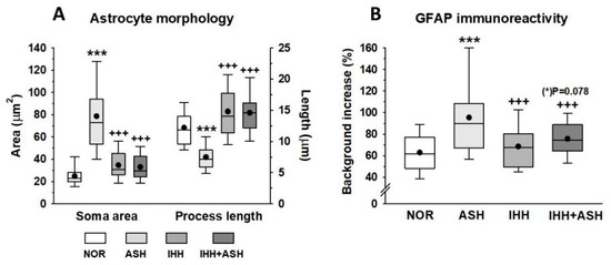 (A) Astrocyte morphometrical parameters (soma area and process length morphology). (B) expression of astrocyte glial fibrillary acidic protein (GFAP) immunoreactivity. All data were obtained in the Cornu ammonis (CA1) hippocampal zone. The box represents the interquartile range in the box-and-whisker plots and shows the first and third quartiles separated by the median. The black dot represents the mean, and whisker endpoints represent the minimum and maximum values. Statistically significant differences between groups are presented with asterisks (*, vs. NOR) or crosses (+, vs. ASH). The three symbols indicate p < 0.001. F-values after running one-way ANOVAs with Bonferroni’s post hoc multiple comparison tests were: F = 85.94 (soma area), F = 119.93 (process length) and F = 20.77 (GFAP immunoreactivity). Animal experimental groups are abbreviated as NOR, normoxic; ASH, acute severe hypoxia; IHH, intermittent hypobaric hypoxia; IHH+ASH, intermittent hypobaric hypoxia followed by acute severe hypoxia.