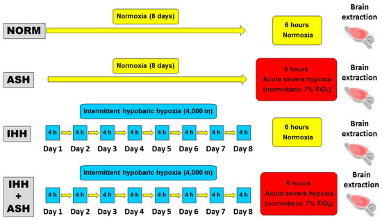 Experimental design and hypoxia exposure protocols. Animal experimental groups are abbreviated as NOR (normoxic), maintained at sea level conditions for the whole experiment; ASH (acute severe hypoxia), exposed to normobaric hypoxia at 7% O2 for a single 6 h continuous session; IHH (intermittent hypobaric hypoxia) exposed to hypobaric hypoxia (4000 m) for 8 consecutive days for 4 h sessions per day; and IHH+ASH, exposed to the intermittent hypobaric hypoxia protocol followed by a single session of acute normobaric hypoxia. Brain extraction was carried out after 6 h of normoxia in NOR and IHH or immediately after 6 h of acute hypoxia in ASH and HII+ASH. Yellow boxes and arrows indicate time spent in normoxia; red boxes are acute normobaric hypoxia sessions, and blue boxes time spent in hypobaric hypoxia.