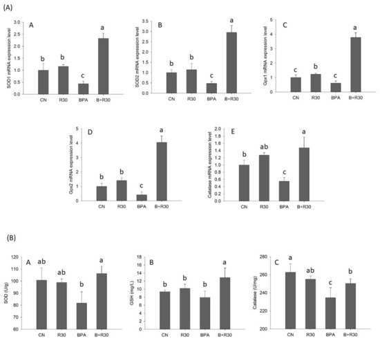 (A) Effects of bisphenol A (BPA) and resveratrol ester on gene expression in the livers of male offspring rats. A: SOD1 gene expression in the liver. B: SOD2 gene expression in the liver. C: Gpx1 gene expression in the liver. D: Gpx2 gene expression in the liver. E: Catalase gene expression in the liver. (B) Effects of BPA and resveratrol ester on antioxidant enzyme activity of male offspring rats. A: SOD activity (U/g) in male offspring rats. B: GSH (mg/L) in male offspring rats. C: Catalase activity (U/mg) in male offspring rats. n = 4–8 per group; a–c p < 0.05, significantly different from other groups. CN = control group; R30 = group administered 30 mg/kg/day of resveratrol butyrate ester (RBE); BPA = group administered bisphenol A at 50 μg/kg/day; BPA + R30 = group administered 30 mg/kg/day of RBE and bisphenol A.