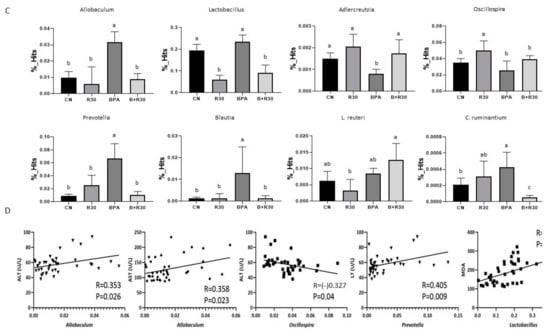An analysis of fecal samples revealed a difference in the abundance of the intestinal flora of the male offspring rats treated with BPA/RBE. Figure 3A shows the relative abundance of intestinal bacteria phyla among the CN, R30, BPA, and BPA + R30 groups according to operational taxonomic unit (OTU) analysis. The observations of the microbiota succession described above indicate that an increase in the abundance of S24-7 in both the BPA + R30 and R30 groups was accompanied by a decrease in the abundance of Prevotella (Figure 3A). The LEfSe analysis showed differences in the abundance of various bacterial species among the CN, R30, BPA, and BPA + R30 groups (Figure 3B). In addition, the analysis of the fecal samples of the male offspring revealed that the abundance of Allobaculum, Lactobacillaceae, Prevotella, and Blautia increased after BPA exposure, with an increase in L. reuteri and C. ruminantium being particularly prominent, whereas the abundance of Adlercreutzia and Oscillospira decreased (Figure 3C). With RBE supplementation (BPA + R30 group), the abundance of S24-7 and Adlercreutzia increased significantly, whereas the abundance of Allobaculum, Blautia, Lactobacillaceae, and Prevotella decreased significantly; a decrease in C. ruminantium was also observed. The correlation analysis (Figure 3D) showed that Prevotella and Allobaculum were positively correlated with the plasma ALT concentration, while Oscillospira was negatively correlated with the ALT concentration. Allobaculum and C. ruminantium were positively correlated with the AST concentration, and Lactobacillaceae was positively correlated with the MDA concentration. The oral administration of BPA in maternal rats disrupted the composition of their gut microbiota. The results of this study further indicate that the perinatal ingestion of BPA by maternal rats also disrupts the gut microbiota in the offspring. This may be attributed to the transfer of BPA from maternal rats to offspring through umbilical cord blood during pregnancy or through breast milk during breastfeeding, which enables BPA to exert its effects on the gut microbiota of the next generation. Additionally, the BPA-induced liver damage observed in the offspring may also influence the gut microbiota distribution via the gut–liver axis.