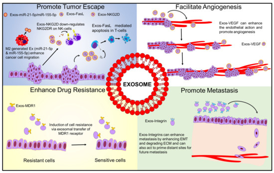 Regarding their pro-tumorigenic effects, exosomes are known to have multiple effects on the tumor microenvironment (TME). The TME consists of multiple components, including immune cells, fibroblasts, the extracellular matrix, basement membrane, endothelial cells, and cancer cells [6]. Considering all of these components, there are four major areas in which exosomes of various origins can affect the TME: promoting immune escape, drug resistance, enhancing metastasis, and promoting angiogenesis [7,8,9]. These effects are summarized in Figure 1.