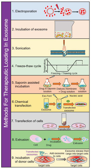 Possibly the most common method of loading exosomes for targeted nucleic acid delivery is to transfect the donor cells with the gene target of interest, which can then be packaged into exosomes [96]. One example of this method was highlighted in a recent study by Katakowski et al., where bone marrow stromal cells were transfected with miR-146b and the exosomes were then collected to treat 9 L gilosarcoma cells. The resulting collected exosomes from the transfected cells showed increased miR-146b expression and were shown to reduce the growth of glioma in rat models [110].