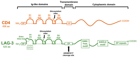 The LAG-3 protein corresponds to a mature protein of 525 residues with a molecular mass of approximately 50 kDa. Both CD4 and LAG-3 extracellular regions are composed of four extracellular immunoglobulin superfamily-like (IgSF) domains (D1-D4) (Figure 2). D1 is an Ig variable-like region (V-SET type), and it includes an extra, unique, proline-rich loop (30 residues) in the middle of the domain (between the C and C′ β strands of the D1 domain) and an unusual intra-chain di-sulfide bridge [8]. Unlike CD4, this loop mediates LAG-3–MHCII interactions [21]. Domains D2, D3, and D4 of LAG-3 belong to the C2-SET, while the CD4 D3 domain is of a V-SET type. D1 and D3 of LAG-3, as well as D2 and D4, share strong internal structural homologies. However, CD4 and LAG-3 only share less than 20% amino acid sequence homology. A β-strand between D1 and D2 and between D3 and D4 extends rigidly between these substructures [20].