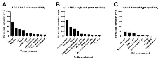 LAG-3 protein and RNA expression profiles from Protein Atlas Analyses (http://www.proteinatlas.org; accessed on 2 May 2021). Images and data credit: Human Protein Atlas. Image and data available from: LAG3 protein expression profiles, The Human Protein Atlas. (A) LAG-3 consensus normalized expression (NX) levels for 55 tissue types and 6 blood cell types, created by combining the data from the three transcriptomics datasets (HPA, GTEx, and FANTOM5), using the internal normalization pipeline. Color coding is based on tissue groups by common functional features. RNA tissue specificity is enhanced in lymphoid and ovary tissues. (B) Summary of LAG-3 single-cell RNA (NX) from the indicated single cell types. Color coding is based on cell type groups, each consisting of cell types with functional features in common. (C) The bar graph represents quantification of RNA-seq data (pTPM) from blood cell types and total peripheral blood mononuclear cells (PBMC) that have been separated into subpopulations by flow sorting.