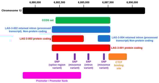 Genomic annotations of the Lag-3 gene locus. The Lag-3 locus is located at chromosome 12: 6,881,678-6,887,621 forward strand. The illustration shows the organization of the Lag-3 locus (http://grch37.ensembl.org/Homo_sapiens/Gene/Summary?db=core;g=ENSG00000089692;r=12:6881678-6887621, accessed on 2 May 2021) [62]. The black bar represents chromosome 12, with positions indicated on top. In green is the Lag-3 coding region. In blue is the transcript retaining one intron. In red is the canonical Lag-3 transcript. In red and blue is the alternatively-spliced Lag-3 transcript. The positions of single-nucleotide polymorphisms are shown below the canonical Lag-3 transcript. The promoter regions are also indicated in pink.