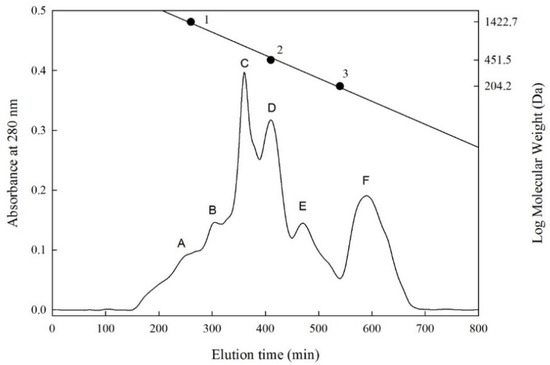 Sephadex G-25 column chromatography of peptides separated from F-HHP + PN-6 + PP. ● (Standard materials) 1, Bacitracin (1422.7 Da); 2, Glycine-Glycine-Tyrosine-Arginine (451.5 Da); 3, Tryptophan (204.2 Da). F-HHP + PN-6 + PP: lactic fermented seabass byproduct hydrolysates produced by Protease N under HHP for 6 h and then rehydrolysis with gastrointestinal proteases. (A–F: numbers of fractions).
