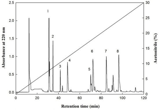 An elution profile of the fraction E from F-HHP + PN-6 + PP by reversed-phase HPLC. Column: Synergi 4u Hydro-RP 80A (250 × 10 mm; particle size, 4 μm; Phenomenex, Torrance, CA, USA); elution A (deionized water containing 0.1% trifluoroacetic acid (TFA) and B (100% acetonitrile containing 0.1% TFA); mobile phase: linear gradient from 0% to 30% of B within 120 min; and flow rate of 1.0 mL/min at room temperature, and detection at 220 nm. (1–8: numbers of the peaks).
