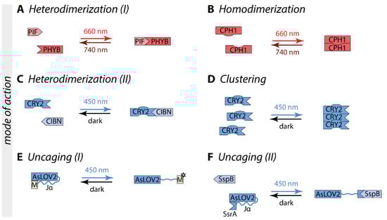 | PHYB/PIF3 & PHYB/PIF6 | PCB | heterodimerization | 660 nm | 740 nm, dark | milliseconds | milliseconds | [18] |