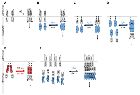 - Bugaj, L.J.; Spelke, D.P.; Mesuda, C.K.; Varedi, M.; Kane, R.S.; Schaffer, D.V. Regulation of endogenous transmembrane receptors through optogenetic Cry2 clustering. Nat. Commun. 2015, 6, 6898. [Google Scholar] [CrossRef] [PubMed]