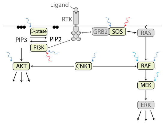 - Fischer, A.; Warscheid, B.; Weber, W.; Radziwill, G. Optogenetic clustering of CNK1 reveals mechanistic insights in RAF and AKT signalling controlling cell fate decisions. Sci. Rep. 2016, 6, 38155. [Google Scholar] [CrossRef]