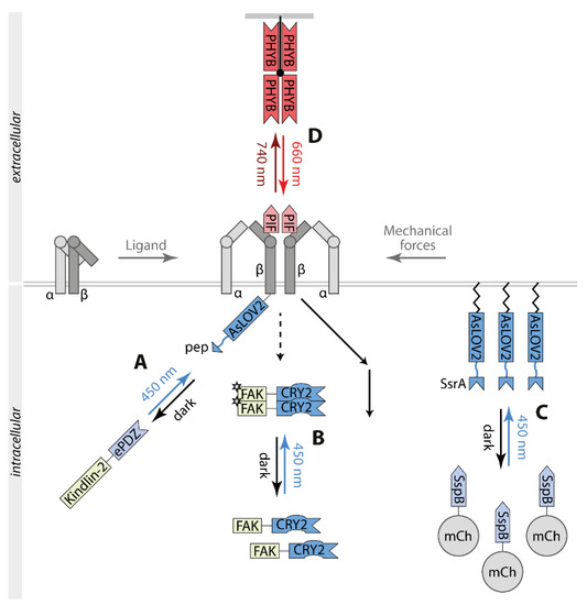 - Baaske, J.; Mühlhäuser, W.W.D.; Yousefi, O.S.; Zanner, S.; Radziwill, G.; Hörner, M.; Schamel, W.W.A.; Weber, W. Optogenetic control of integrin-matrix interaction. Commun. Biol. 2019, 2, 15. [Google Scholar] [CrossRef]