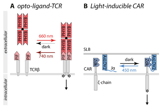 - Yousefi, O.S.; Günther, M.; Hörner, M.; Chalupsky, J.; Wess, M.; Brandl, S.M.; Smith, R.W.; Fleck, C.; Kunkel, T.; Zurbriggen, M.D.; et al. Optogenetic control shows that kinetic proofreading regulates the activity of the T cell receptor. eLife 2019, 8, e42475. [Google Scholar] [CrossRef]
