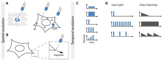 - Toettcher, J.E.; Weiner, O.D.; Lim, W.A. Using optogenetics to interrogate the dynamic control of signal transmission by the Ras/Erk module. Cell 2013, 155, 1422–1434. [Google Scholar] [CrossRef]